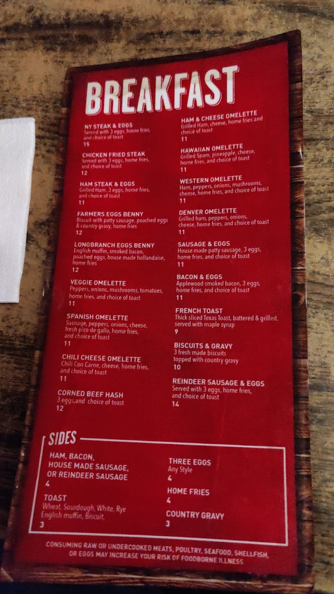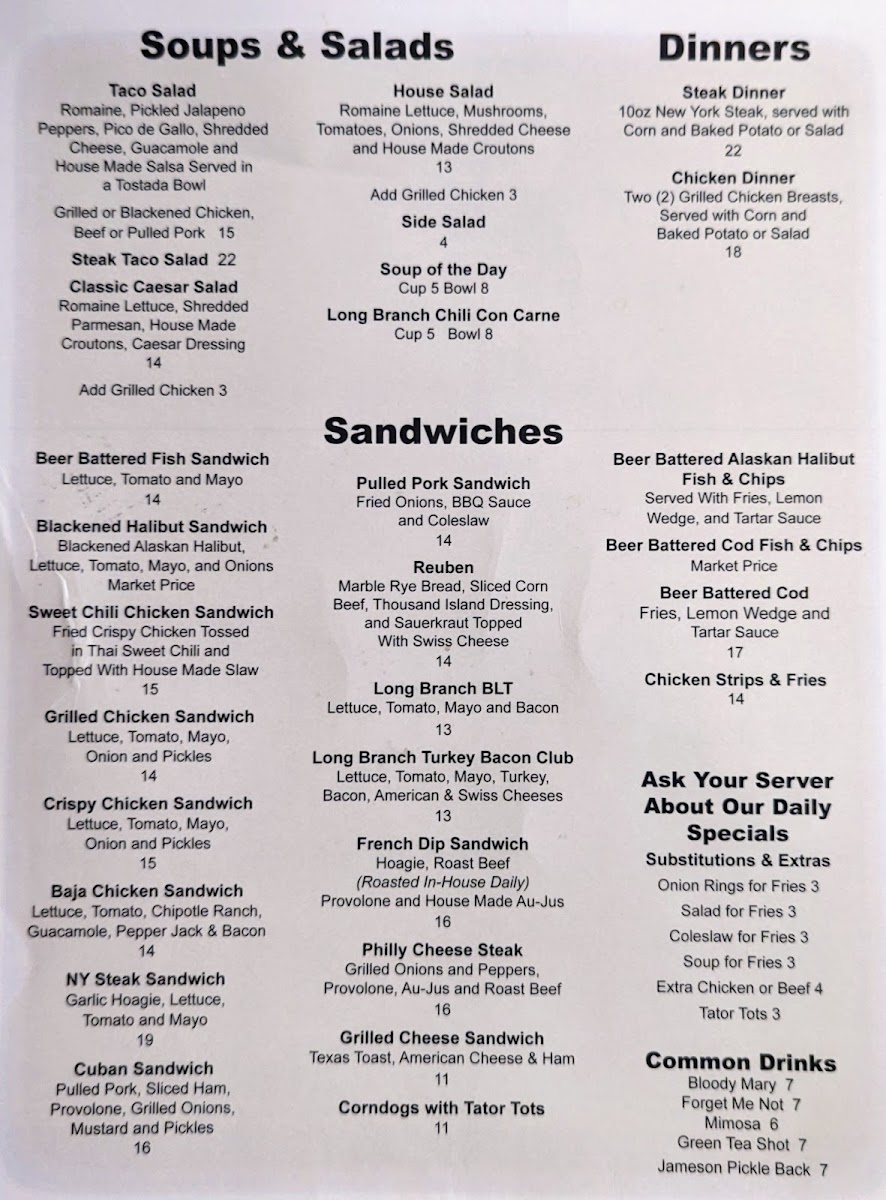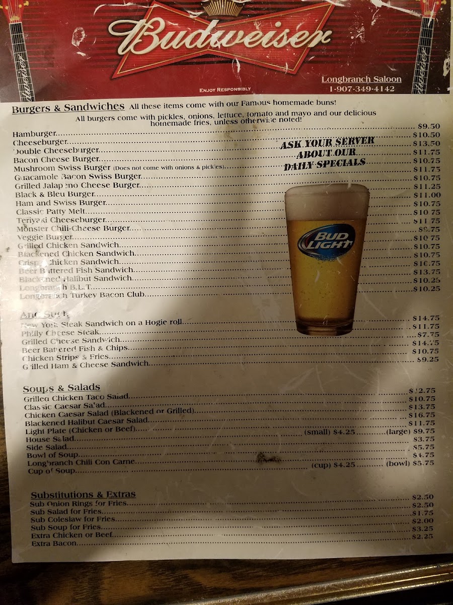 Welcome to Long Branch Saloon, a lively bar and grill located in Anchorage, Alaska, where hearty meals meet a rustic ambiance. Their menu features an array of crowd-pleasers, from the savory Taco Salad served in a tostada bowl to classic burgers like the Cheeseburger and Hamburger, both affordably priced. For a more substantial option, indulge in the 10 oz. New York Steak Dinner or flavorful grilled chicken. Each dish shines with quality ingredients, showcasing the kitchen's dedication to comfort food at its best.